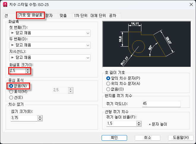 ☞ "기호 및 화살표" 탭에서는 화살표와 중심표식에 대한 설정을 한다. 화살표 모양을 변경할 수도 있다.