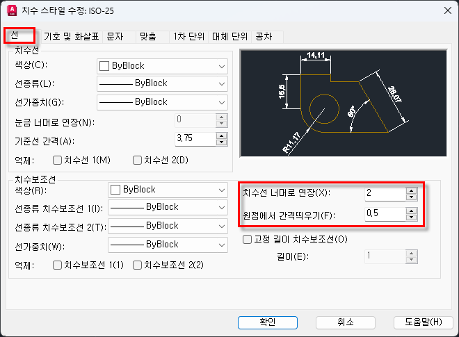 ☞ 먼저, "선" 탭에서는 치수선과 치수보조선에 대한 설정을 한다. 아래 그림에서 보이는 것과 같이 설정한다.