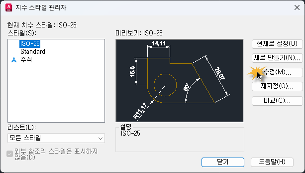 ☞ 다음과 같이 "치수 스타일 관리자" 창이 뜨면 "수정"버튼은 클릭해서 스타일을 수정한다.