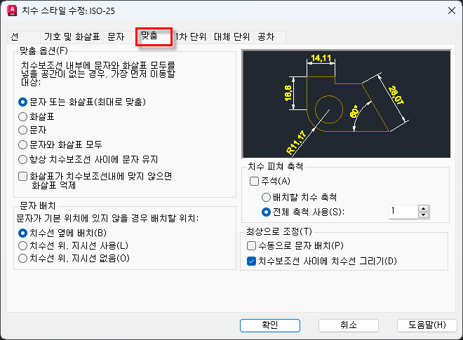 ☞ "맞춤" 탭에서는 당장 설정할 것은 없고 지름, 반지름 치수를 기입할 때 수시로 수정해서 사용한다. 그리고 "치수 피쳐 축척"은 치수 축척을 나타내며, 명령어로는 "Dimscale" 이다. 치수 스타일 전체를 축척할 때 사용하는 기능이다.