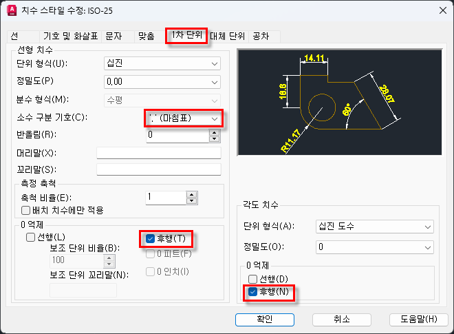 ☞ "1차 단위" 탭에서는 단위형식, 정밀도 등 아래 이미지와 같이 설정할 수 있다.