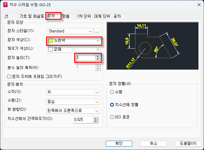 ☞ "문자" 탭에서는 문자스타일, 문자색상, 문자높이를 설정한다. "문자정렬"은 지름, 반지름 치수를 기입할 때 수시로 수정해서 사용한다.