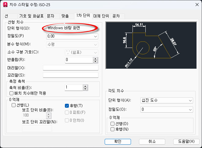 [그림2] 창에서 [1차 단위]탭을 선택한 후, 그림과 같이 '단위 형식(U)' 을 'Windows 바탕 화면'으로 설정한다. 확인으로 빠져나간 후, 치수기입하면 1000단위마다 콤마(Comma)가 기입되는 것을 확인할 수 있다.