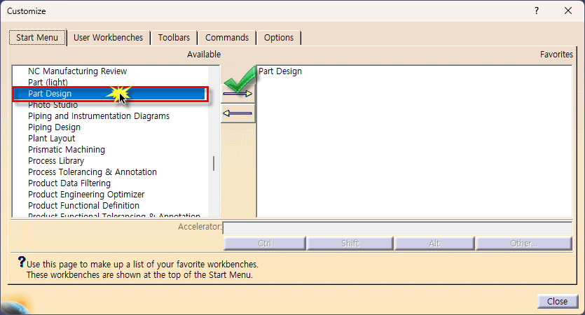 그러면 아래와 같이 창이 나타난다. [시작메뉴] 탭에서 설정할 수 있다. 왼쪽 화면에서 [Part Design]을 클릭한 후, 가운데 화살표 중 위에 화살표를 클릭하여 오른쪽으로 [Part Design] 를 보내다. 마지막으로 닫기[Close]를 클릭하면 끝 !!