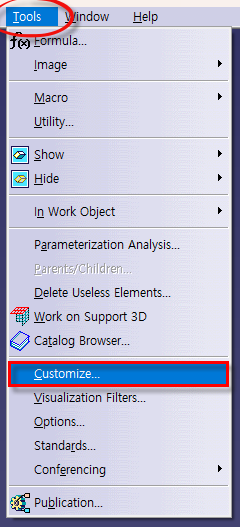 먼저, 도구[Tools] 탭을 클릭한 후, 사용자화[Customize...]를 클릭한다.