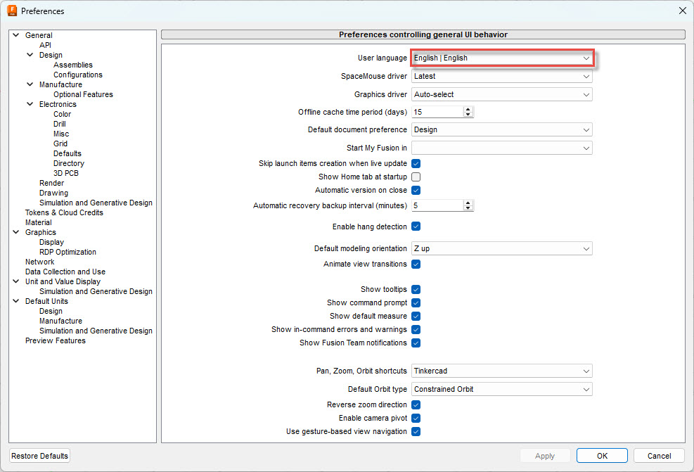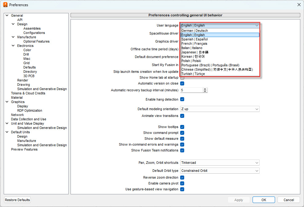 3. 'User language'의 오른쪽 부분의 리스트에서 원하는 언어를 선택한다.