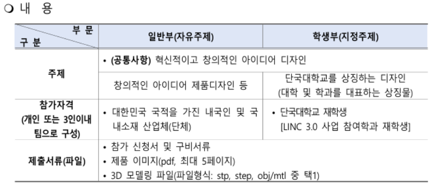 | 공모전 안내 사이트 | 단국대학교첨단제조융합센터공모전사이트 (제출서류는 공모전 사이트 맨 아래에도 다운로드 링크가 있습니다) |