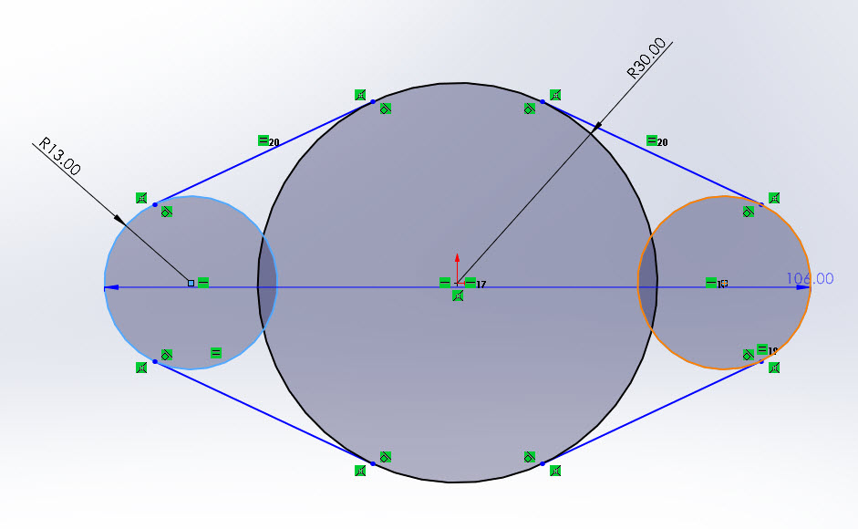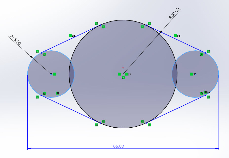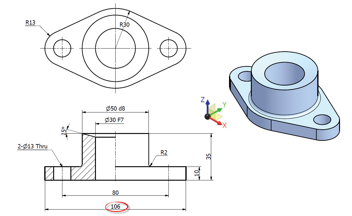 3D CAD마다 접선치수를 기입하는 방법은 각기 다르다. [그림1]에서 치수 106에 해당한다. 이 치수는 R13 호의 양쪽에 외접하는 치수를 나타내고 있다. 그럼 솔리드 웍스에서는 어떻게 기입할까?