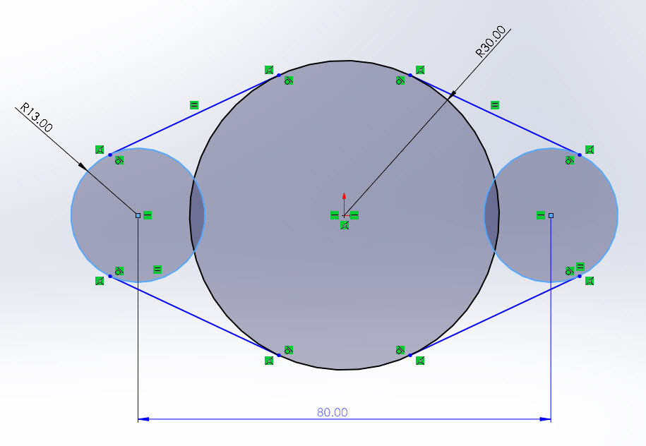 [그림1]과 같이 R13을 호(ARC)의 형상으로 스케치하면 호의 중간점(Mid Point)를 선택해서 접선치수를 넣을 수 있을 것이다. 하지만 솔리드웍스나 인벤터의 경우는 [그림2]와 같이 굳이 자르기(Trim)를 하지 않고 원의 형태를 그대로 유지한다. 이때는 원의 외접으로 치수 기입해야 한다. [그림2]는 치수기입할 때 양쪽원을 선택했을 때의 치수 형태이다. 보는 것과 같이 양쪽 원의 원주를 클릭했는데 원의 중심간 거리가 기입되는 것을 확인할 수 있다.