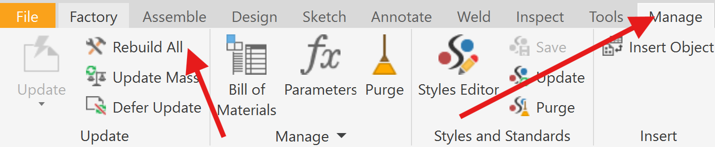 모델이나 어셈블리에서 수정 작업을 수행한 후, 일부 파트가 제대로 업데이트되지 않거나 예상대로 변화하지 않을 때 Rebuild All을 실행한다. 이 기능은 모델의 모든 요소를 다시 계산하고 재구성하여 최신 상태로 만든다. - 제작 순서가 변경될 때: